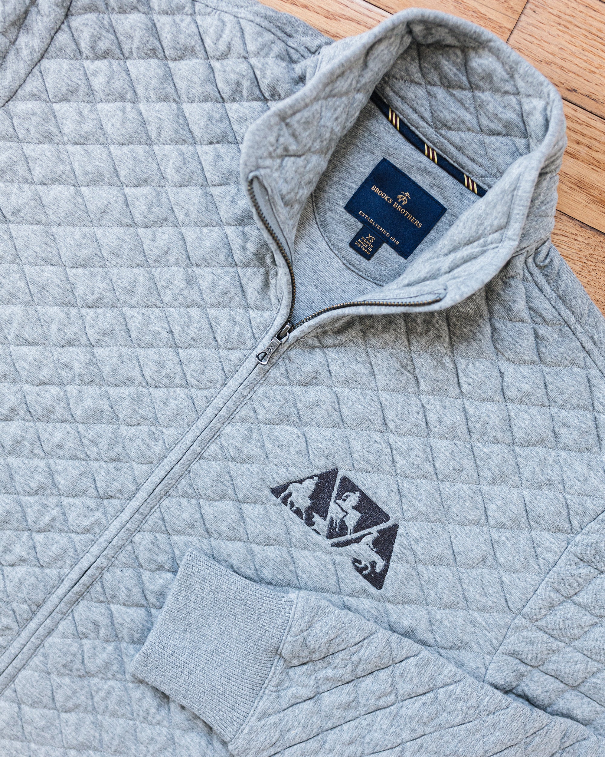 - Metal zipper with antique silver Brooks Brothers logo zipper pull
