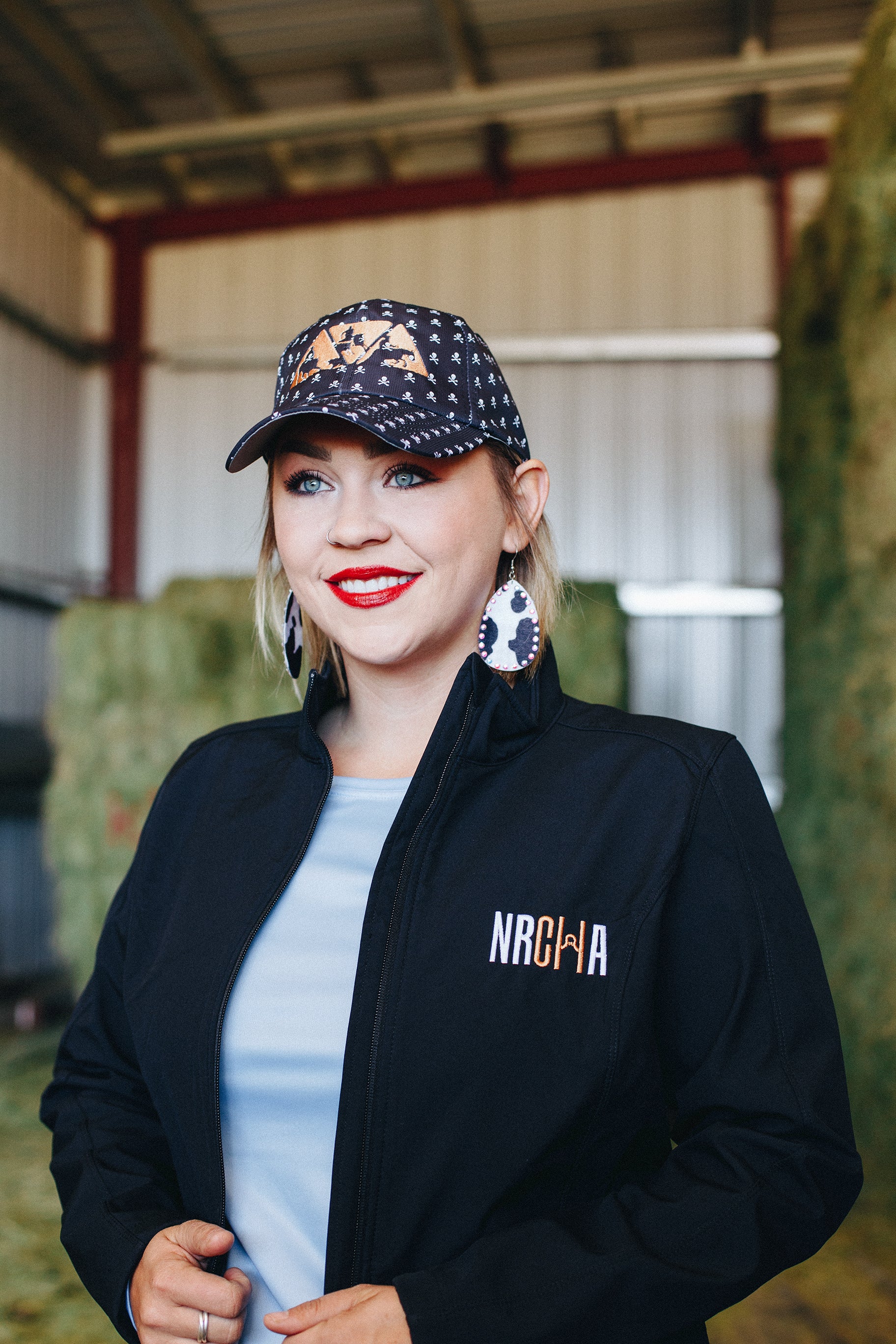 The NRCHA Logo Signature Series Women's Jacket in black. Classic and functional soft shell fabric. NRCHA Triangle Logo on back and smaller NRCHA logo on front.